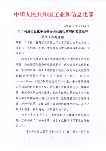 關(guān)于利用信息化平臺做好兩化融合管理體系貫標(biāo)等相關(guān)工作的通知(工信函[2014] 69號)