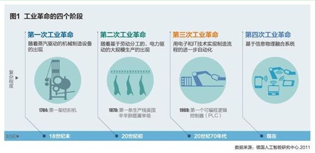 與美國(guó)流行的第三次工業(yè)革命的說法不同,德國(guó)將制造業(yè)領(lǐng)域技術(shù)的漸進(jìn)性進(jìn)步描述為工業(yè)革命的四個(gè)階段,即工業(yè)4.0的進(jìn)化歷程(圖1)。